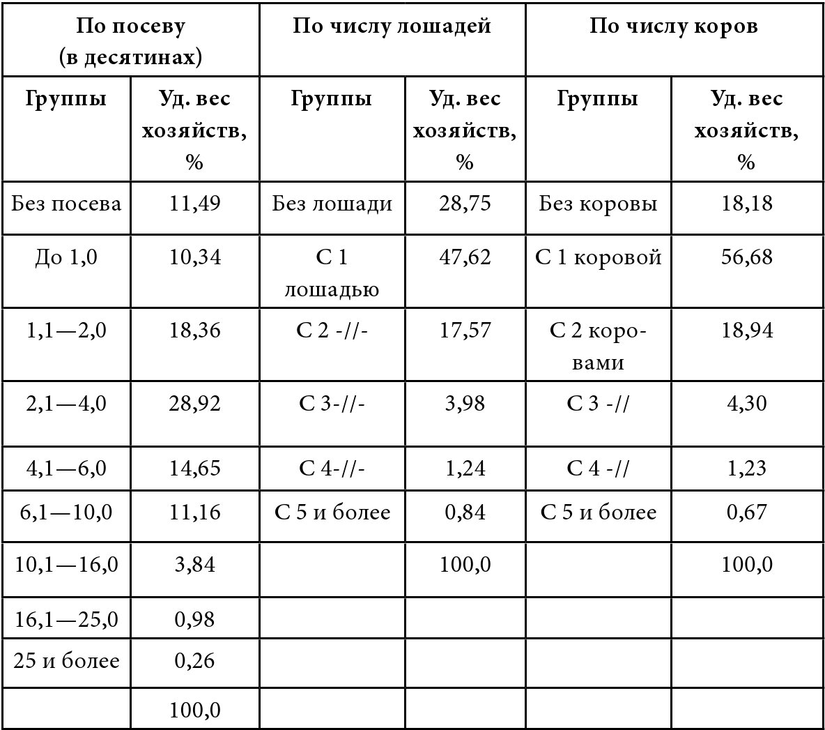 Этот материал предоставила статистическая выборка, в основу которой положено исследование 427 тысяч крестьянских хозяйств по 25 губерниям. Исследование не тотальное, однако довольно масштабное. Как мы видим из таблицы, бедняцких хозяйств, по всем трем показателям, насчитывалось около 75 %.