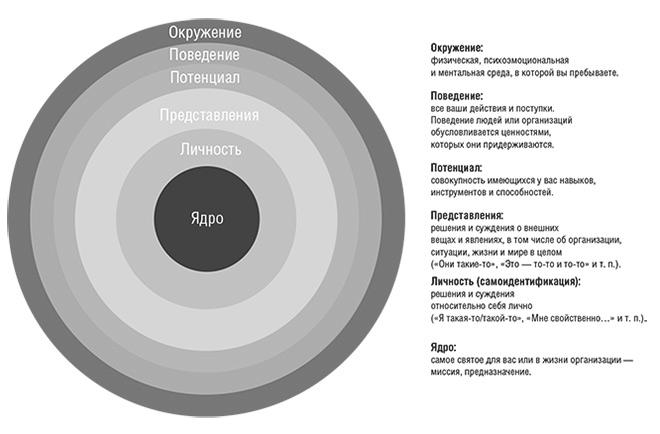 ЛОГИЧЕСКИЕ УРОВНИ ИЗМЕНЕНИЙСогласно теории антрополога Грегори Бейтсона[4], люди переживают изменения на определенных логических уровнях2. У нас в STI принято схематически представлять эти уровни в виде концентрических кругов. В рамках такой модели легко представить, что изменения могут как инициироваться извне и доходить до глубин личности, так и идти изнутри вовне или же протекать на встречных курсах. На рисунке 1–1 отражено, как именно работает эта модель концентрических кругов.
