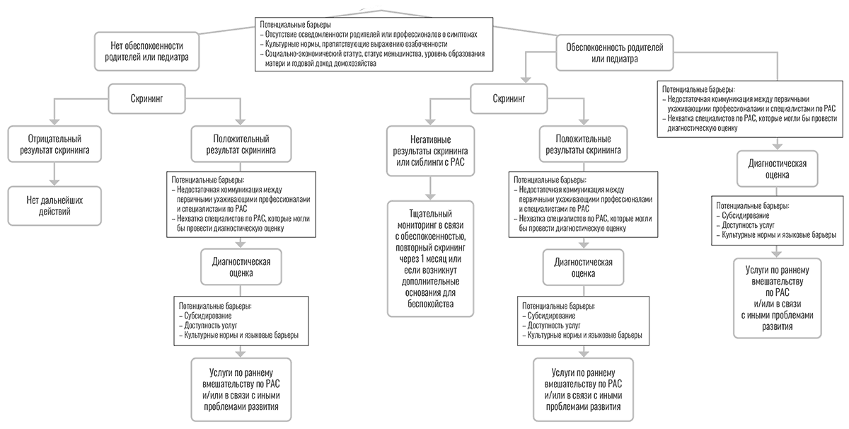 Разнообразие факторов, влияющих на каждый этап процесса скрининга, подчеркивает необходимость, по крайней мере, более широкого внедрения стандартного скрининга среди известных групп высокого риска, таких как младшие сиблинги детей с РАС или младенцы, родившиеся раньше срока. Кроме того, для оптимизации доступа к услугам скрининга должны быть доступны инструменты скрининга, которые могут быть заполнены на различных языках, устно, письменно или онлайн. Необходимы усилия для обеспечения доступности стандартного скрининга для различных групп населения, с тем чтобы уменьшить неравенство в возрасте первой идентификации среди меньшинств, малообразованных и семей с низким социально-экономическим статусом. Одним из предлагаемых методов ослабления влияния этих социальных детерминант здоровья на процедуры скрининга и направления к специалисту является привлечение к проведению скрининга лиц, оказывающих услуги по уходу за детьми и первую медицинскую помощь (Janvier et al., 2016). Если педиатры будут следовать рекомендации USPSTF 2016 г. и проводить скрининг только тогда, когда будет высказываться озабоченность, и если не будут найдены дальнейшие меры по устранению вышеперечисленных барьеров, то дети из меньшинств или малообразованных семей с большей вероятностью будут пропущены. Резюме процесса скрининга – см. рис. 2.1.