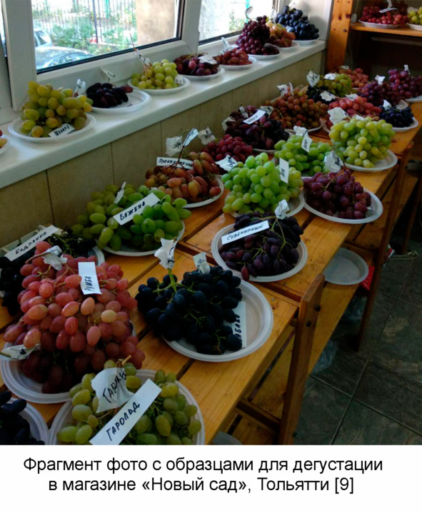В Тольятти некоторые сорта можно даже попробовать на вкус на осенних выставках образцов винограда, проводимых в сентябре в Магазине «Новый сад» Тольятти, ул. Жукова 1-б, тел.53-67-02. С 10 час. Время выставки также оповещается на сайте http://sadtlt.ru. Ниже представлен, с любезного разрешения фирмы «Новый сад», фрагмент фото с подготовленными образцами сортов винограда для дегустации. Свидетельствую, что через месяц после открытия на тарелочках остаются только следы от богатых и красивых кистей.