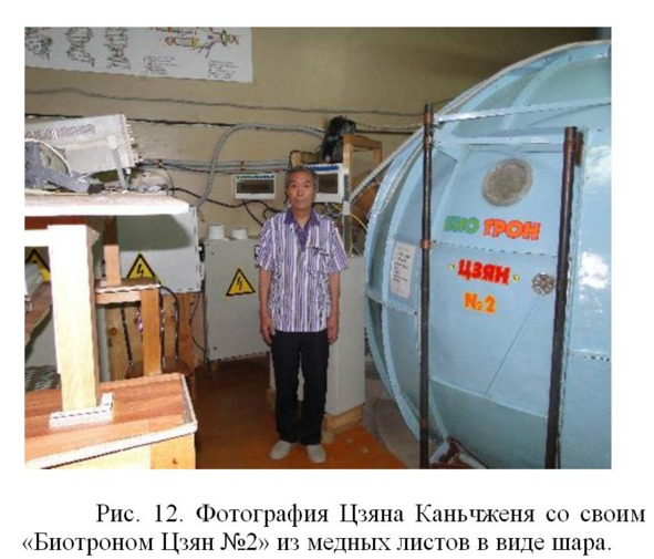 Позже заинтересованные люди помогли сделать новую качественную установку в виде шара из медных листов, которую назвали «Биотрон Цзян №2» (Рис. 11, 12). На способ омоложения организма в 1996 году Цзян Каньчжен получил патент РФ (Цзян Каньчжен, 1996).