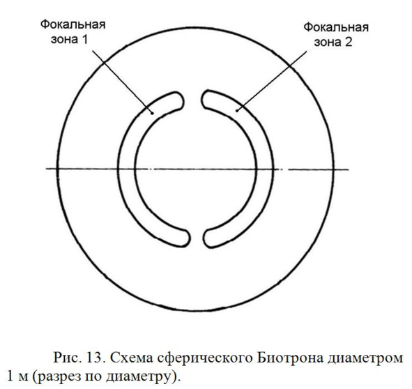 Опытных животных помещали в один фокус сферического Биотрона (Рис. 13) диаметром 1 м, а доноры излучения ставили в другой фокус установки. Из-за большого количества мышей они не могли сразу поместиться в фокальную зону, поэтому их разбили на 3 группы по 100 мышей, и в течение суток по 100 животных помещали на 7—9 ч ежесуточно в фокальную зону поочередно. В сумме за 3 месяца получилось, что каждая мышь провела в Биотроне 720 часов.