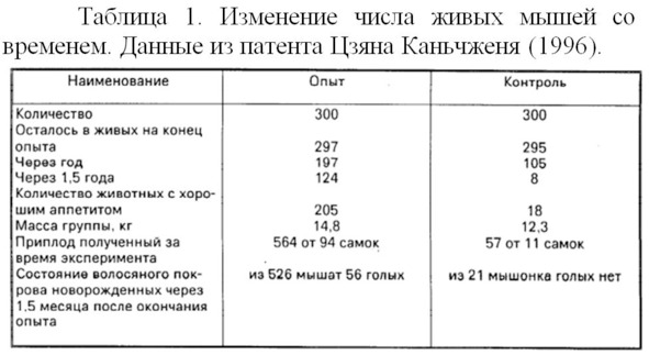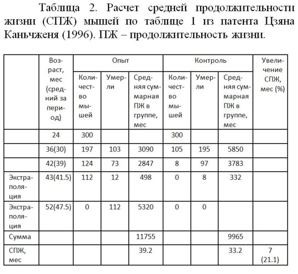Средняя продолжительность жизни мышей в эксперименте Цзяна Каньчженя, по нашим оценкам, составила в опыте 39.2 мес., а в контроле 32.2 мес. Т.е. облученные пожилые мыши разными молодыми биологическими объектами прожили на 7 месяцев или на 21.1% дольше, чем контрольные. Поскольку использовали по 300 мышей в группе, то вероятность отличия между контролем и опытом должна быть очень высокой.