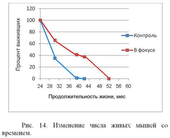 Результаты опыта отражены в таблицах 1 и 2, а также на рисунке 14. Основываясь на табличных данных патента (Табл. 1) мы провели некоторые расчеты, сделали экстраполяцию данных (Табл. 2) и построили график изменения числа живых мышей со временем в опыте и контроле (Рис. 14).