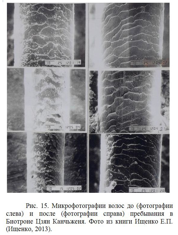 Пример действия Биотрона на волосы показан на рисунке 15. Человек прошел курс пребывания в Биотроне Цзяна Каньчженя. При этом на электронном микроскопе были сфотографированы его волосы до начала пребывания в Биотроне и после нескольких сеансов. На фотографиях видны существенные разительные отличия тех и других волос.