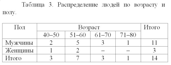 Заболевания у 11 мужчин и 3-х женщин распределились следующим образом: атеросклероз – у 5 пациентов; стенокардия – у 2-х; язвенная болезнь желудочно-кишечного тракта – у 4-х; гепатит – у 5-х; остеохондроз позвоночника – у 6-и; перенесенный инсульт – у 2-х; артроз – у 2-х; экзема – у 3-х; псориаз – у 1-го; невроз – у 7-и; доброкачественная опухоль – у 2-х. Средний возраст примерно 60 лет. Врачи часто говорят таким пациентам, которых не могут вылечить: «Что вы хотите? Возраст!».