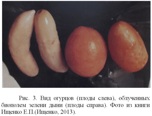 Также Каньчжен брал плоды ананаса, яблони, зеленую массу дыни, закладывал их поочередно в установку и облучал их сфокусированным биополем семена огурцов одного сорта в весеннее время и высаживал в почву на прорастание. Осенью он собрал урожай и обнаружил, что огурцы, выращенные из семян, облученных плодами ананаса, стали более округлые, чем контрольные, приобрели вкус ананаса и у них появились колючки; огурцы, выращенные из семян, облученных яблоками, приобрели вкус яблок, форма стала округлой, а кожа гладкой; и, наконец, огурцы из семян, облученных зеленью дыни стали обладать вкусом дыни, приобрели овальную форму, внутренняя структура и биохимический состав приблизились к структуре и биохимии дыни. Изменения огурцов, облученных зеленью дыни, сохранились в 15 последующих поколениях и передались дальше (Рис. 3). Огурцы и подсолнечник 11—15 лет сохраняли свои новые, благоприобретенные качества.