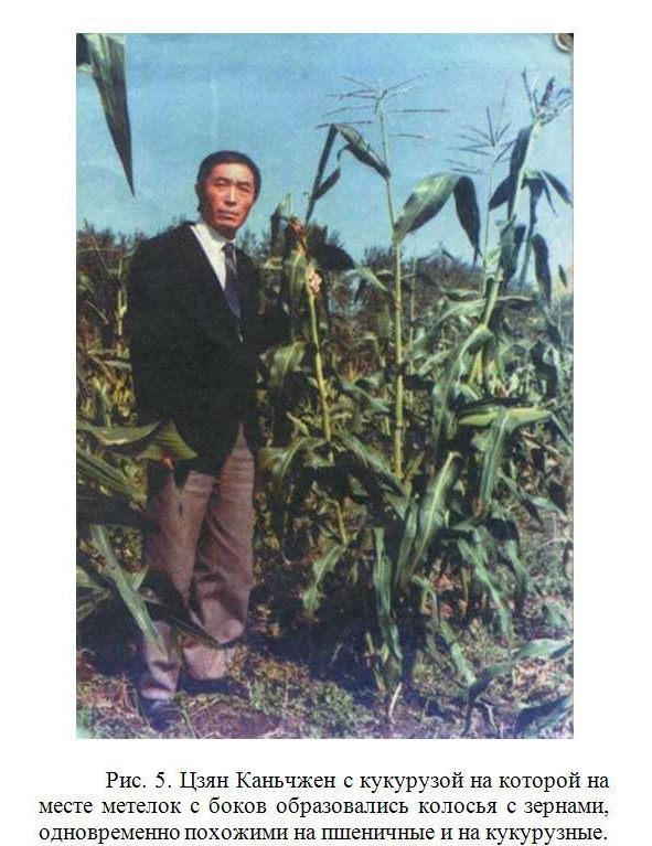 В 1979 году Цзян Каньчжен воздействовал биополем зеленой массы пшеницы на проросшие семена кукурузы. Среди выросшых 7000 стеблей кукурузы у 3850 из них на месте метелок с боков образовались колосья с зернами, одновременно похожими на пшеничные и на кукурузные (Рис. 4 и 5). «Облученная» кукуруза по урожайности зерна вдвое, а по зеленой массе втрое превзошла контрольную группу. Полученные изменения передавались последующим поколениям. Зафиксировано минимум 3 поколения, а по другим сведениям изменения сохранялись в течение 10 лет.