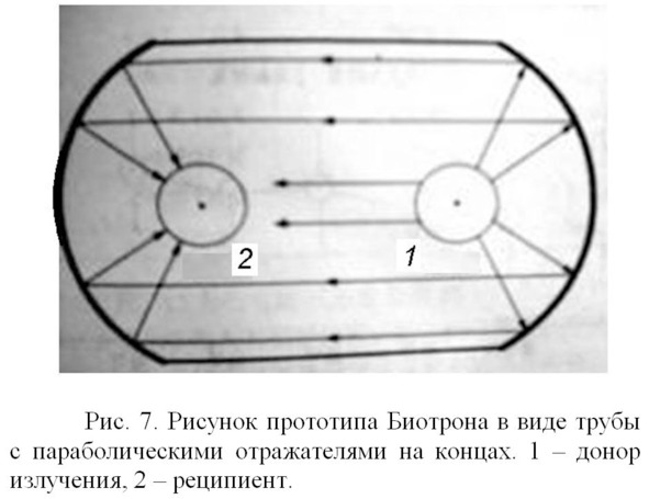 Позже он разработал другую конструкцию в виде трубы большого диаметра. На ее концах были установлены параболические зеркала. В фокусе одного зеркала помещался объект – донор излучения, а в фокусе другого зеркала размещался объект – реципиент, принимающий биоизлучение (Рис. 7).