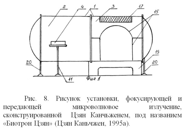 Позже Цзян Каньчжен разработал и запатентовал более совершенное устройство (Рис. 8) и назвал его «Биотрон Цзян» (Цзян Каньчжен, 1995а). В этом варианте, в отличие от предыдущего (Рис. 7) он сделал такую конструкцию, в которой уменьшается влияние донора излучения на реципиента, принимающего энергоинформационное воздействие, за счет установления специальной перегородки между двумя зонами Биотрона, проницаемой для электромагнитного излучения. В зоне (2) на подставке (4) располагаются излучающие объекты, а в зоне (3) в области (15) размещаются принимающие излучение биологические объекты. Для человека предусматривается кровать или раскладушка, для растений или животных предусматриваются другие приспособления.