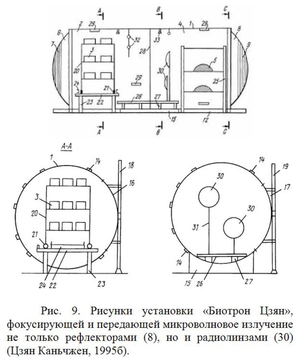 В этом же году Цзян Каньчжен подал заявку на модифицированную установку Биотрон и затем получил на нее патент (Цзян Каньчжен, 1995б). В этом Биотроне (Рис. 9) применяется многоэтажный стеллаж (20) для размещения растений или мелких животных в качестве доноров биологического излучения. Кроме того, в Биотроне установлены специальные радиолинзы (30) для дополнительного концентрирования биоизлучения. В этом же патенте в формуле изобретения он указывает на вариант Биотрона, который образуется двумя противоположными рефлекторами в виде единой сферы без цилиндрической части между ними.