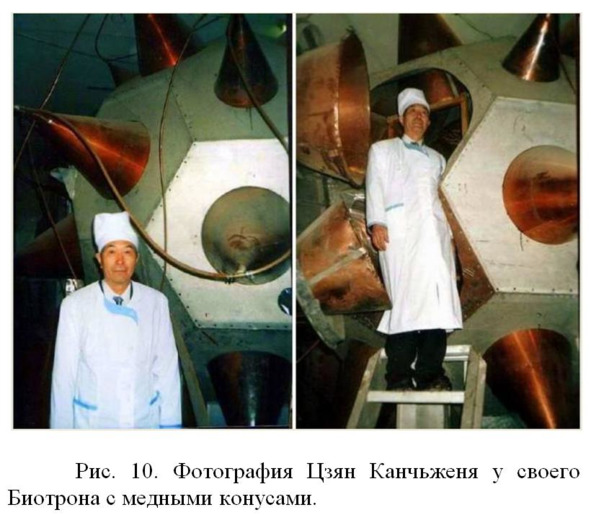 На рисунке 10 показан еще один вариант Биотрона Цзяна Каньчженя с медными конусами. Трубы, которые подходят к конусам – это волноводы. Излучение приходит по этим волноводам от донора и от нескольких конусов внутри в центре устройства возникает фокальная зона. К сожалению документальное описание работы этого Биотрона отсутствует.