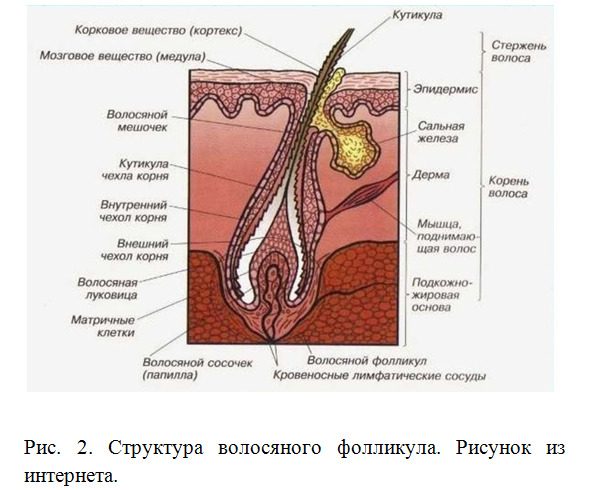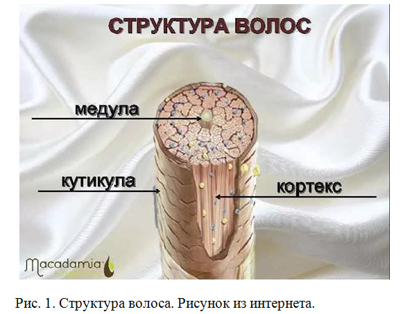 Внутри ствола волоса находится мозговое вещество медула и среднее корковое вещество кортекс, а снаружи имеется внешняя оболочка – кутикула (Рис. 1).