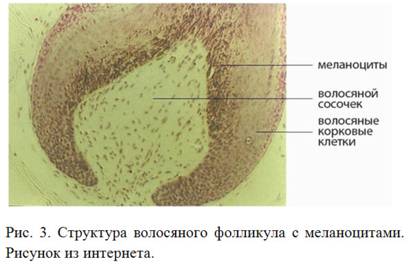 Волосы окрашиваются специальным пигментом меланином, который вырабатывается особыми клетками меланоцитами, находящимися в каждом волосяном фолликуле, где растут сами волосы. Считается, что популяция меланоцитов поддерживается за счет наличия некоторого количества стволовых клеток в основании волосяного сосочка (Nishimura et al., 2002). Соответственно, старческие изменения в пуле этих клеток могут приводить к уменьшению числа меланоцитов, производящих пигменты меланины. По нашему мнению, свой вклад может вносить нарушение транспортных путей движения меланина от меланоцитов к частям растущего волоса.