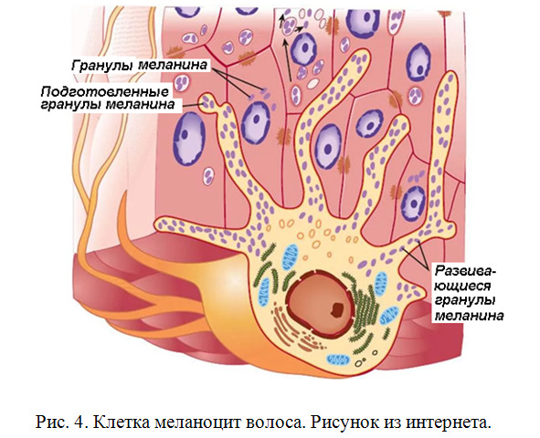 На рис. 4 показана клетка меланоцит, а также процесс образования и миграции гранул меланина через отростки меланоцита наружу в кортекс растущего ствола волоса. Большую роль в онтогенезе волоса играют стволовые клетки, которые находятся в зоне боковой выпуклости фолликула, а также в самой нижней его части. Из них могут появится сальная железа и некоторые части эпидермиса. В стадии анагена они производят новую волосяную луковицу и стержень волоса.