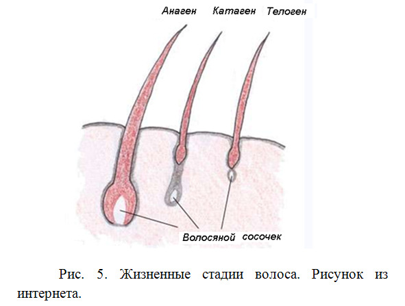 Каждый волос существует от нескольких месяцев до 4—6 и даже 8 лет, затем выпадает и заменяется новым. Цикл волосяного фолликула состоит из нескольких фаз: нескольких стадий анагена, катагена и телогена (Рис. 5). В ранней стадии анагена новый волос начинает расти тогда, когда старый волос еще не выпал и еще остается в волосяной сумке. При этом в любой стадии волоса волосяной сосочек остается неповрежденным. Он может перемещаться в коже по глубине. В катагене деление клеток прекращается, пигмент не образуется, фолликул сокращается, основание фолликула перемещается по направлению к эпидермису. Длительность фазы 2—3 недели. В стадии телогена волос находится в фазе покоя. Старый волос выпадает в этой фазе или в следующей ранней стадии анагена, фолликул практически изчезает, а сосочек передвигается ближе к эпидермису. Сам волос (ствол) может выпасть в это время или выпадает уже в следующей наступающей ранней стадии анагена. Длительность телогена 1—3 месяца. Установлено, что у здоровых людей 80—90% волос находятся в стадии анагена, 1—2% – в стадии катагена, и 10—15% – в стадии телогена (Paus, Foitzik, 2004).