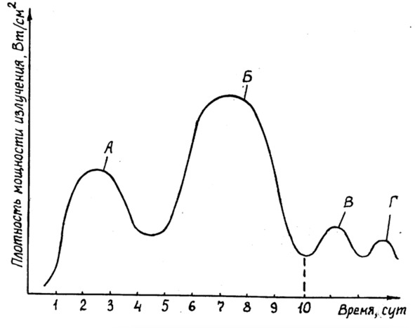 В патенте RU 2108028, авторы Котов Б.С и Гавинский Ю. В., 1996 [16], приведены результаты измерений биологического излучения ростков различных растений в диапазоне длин волн от 2 мкм до 2 мм (Рис. 1). По одной оси указана плотность мощности излучения (W/cm2), а по другой оси возраст ростков в днях.