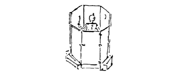 Леонардо да Винчи (Leonardo da Vinci) (1452—1519, Рис. 3). Сохранился его чертеж восьмиугольной «зеркальной камеры» (Рис. 4). В одной из своих записных книжек он нарисовал макет устройства, которое он назвал Mirror Chamber, ―зеркальная комната. О назначении камеры ничего не известно. Зеркала, скорее всего были изготовлены из полированного металла, поскольку плоские стеклянные зеркала таких размеров во времена Леонардо делать еще не умели.