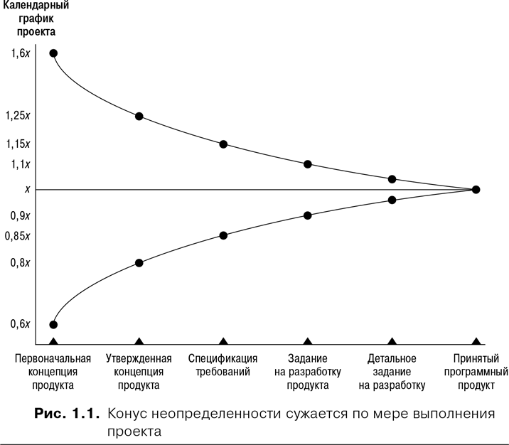 Оценка и планирование критически важны, однако сложны и подвержены ошибкам. Так или иначе, отказываться от них просто из-за трудности нельзя. Оценки, данные в начале проекта, значительно менее точны, чем оценки, полученные позднее. Графическое представление процесса постепенного повышения точности оценок называют конусом неопределенности.