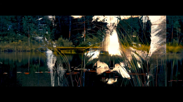 Вы (через объектив камеры) поднимаетесь из темной глубины лесного озера на гладь, залитую солнцем. Яркий свет. Вы слепните. Глаза привыкают, сквозь белизну света начинает проступать поверхность воды, в ней очертания берегов озера, где шумит лес. Вы скользите по ее поверхности к этим отражениям в лучах жаркого солнца. Легкие брызги окутывают вас со всех сторон. В каплях, зависших в воздухе вокруг вас, ваше отражение – незримая сущность. (графика —молекулярные формулы) ВЫ рассматриваете каждую каплю с разных сторон – в ней нет вас, а только отражения прекрасного земного мира. (графика – математические цифры) Вы поднимаетесь на мостик, увлекая за собой влажность, наполняя воздух им. (графика – химические элементы) Дерево на подмостках становится мокрым. Через влажный воздух свежим взглядом смотрите на камыш, кувшинки, траву. (графика – письменные тексты) Вы идете по тропинке в глубину леса. Лучи пробивают сквозь чащу. Хруст веток под ногами. От невероятной свежести все резкое. Только что прошел летный дождь и все вокруг переливается и искрится.