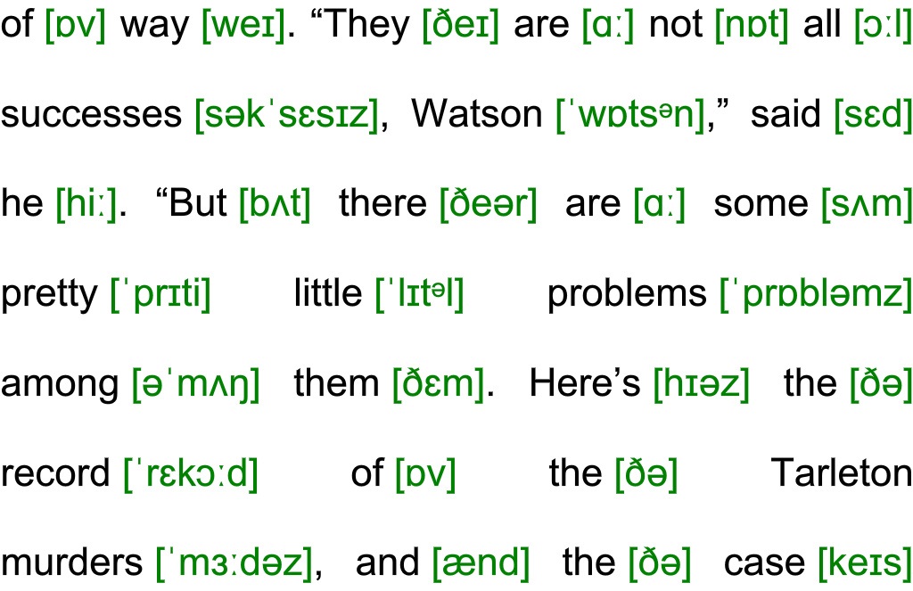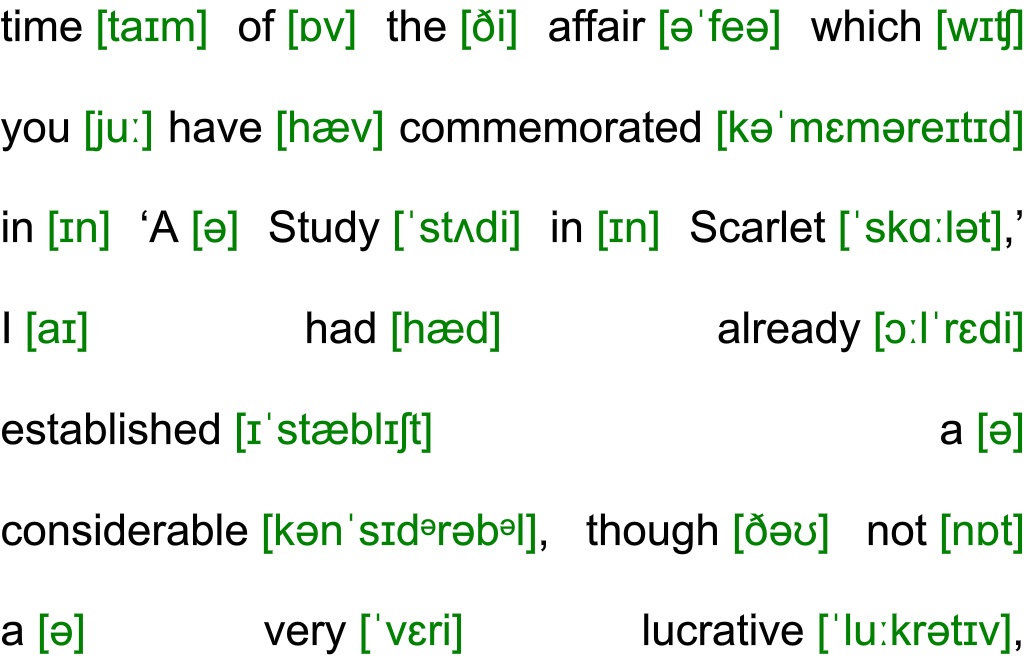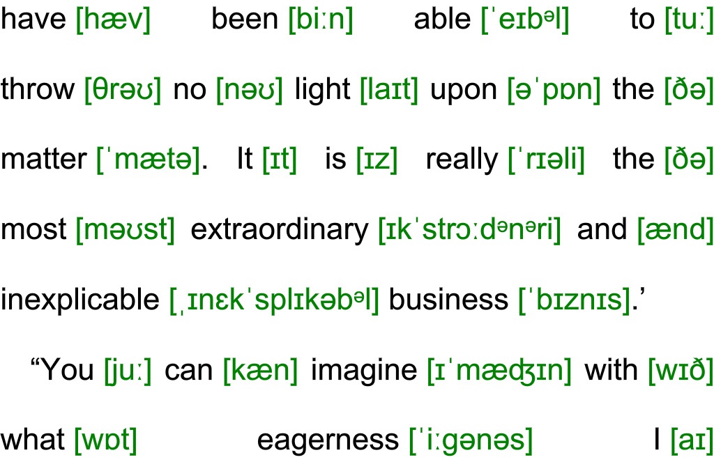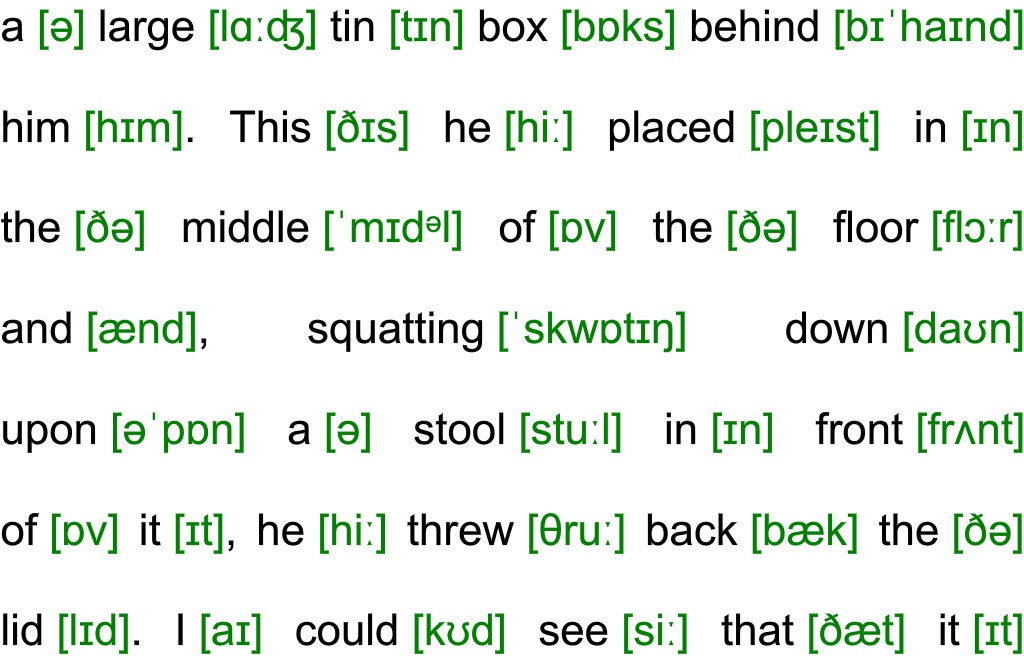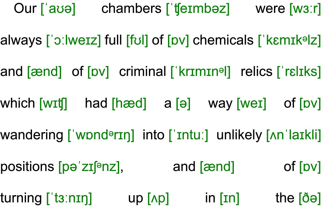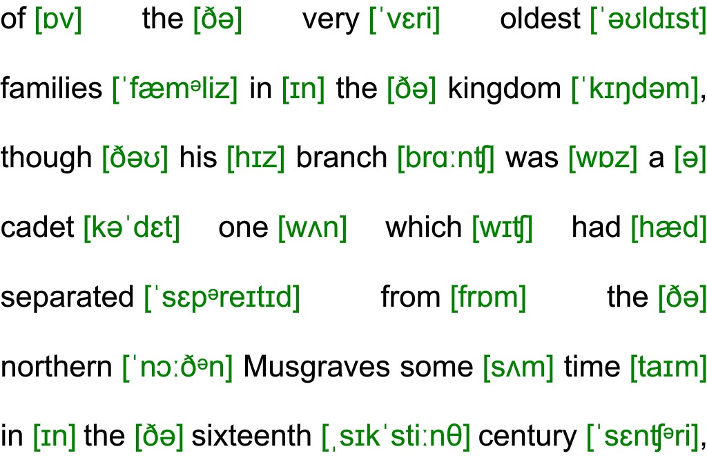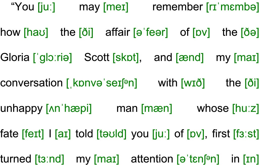 В данной книге приводится транскрипция текста рассказа А.К. Дойла «Обряд дома Месгрейвов» на английском языке. Текст рассказа разбит на небольшие фрагменты. Фрагменты пронумерованы порядковыми номерами (01, 02,…,50). После номера фрагмента приведены время начала и окончания аудиозаписи текста фрагмента в аудиокниге. Для каждого фрагмента подготовлена транскрипция текста, оформленная в виде иллюстраций с изображением транскрипции текста фрагмента.