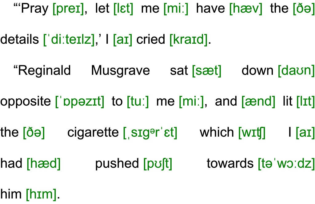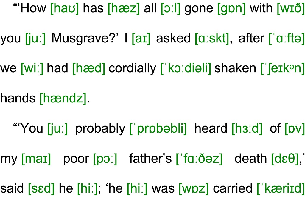 “Reginald Musgrave had been in the same college as myself, and I had some slight acquaintance with him. He was not generally popular among the undergraduates, though it always seemed to me that what was set down as pride was really an attempt to cover extreme natural diffidence. In appearance he was a man of exceedingly aristocratic type, thin, high-nosed, and large-eyed, with languid and yet courtly manners. He was indeed a scion of one of the very oldest families in the kingdom, though his branch was a cadet one which had separated from the northern Musgraves some time in the sixteenth century, and had established itself in western Sussex, where the Manor House of Hurlstone is perhaps the oldest inhabited building in the county. Something of his birthplace seemed to cling to the man, and I never looked at his pale, keen face or the poise of his head without associating him with grey archways and mullioned windows and all the venerable wreckage of a feudal keep. Once or twice we drifted into talk, and I can remember that more than once he expressed a keen interest in my methods of observation and inference.
