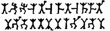 ‘Suddenly, as she spoke, I saw her white face grow whiter yet in the moonlight, and her hand tightened upon my shoulder. Something was moving in the shadow of the tool-house. I saw a dark, creeping figure which crawled round the corner and squatted in front of the door. Seizing my pistol, I was rushing out, when my wife threw her arms round me and held me with convulsive strength. I tried to throw her off, but she clung to me most desperately. At last I got clear, but by the time I had opened the door and reached the house the creature was gone. He had left a trace of his presence, however, for there on the door was the very same arrangement of dancing men which had already twice appeared, and which I have copied on that paper. There was no other sign of the fellow anywhere, though I ran all over the grounds. And yet the amazing thing is that he must have been there all the time, for when I examined the door again in the morning, he had scrawled some more of his pictures under the line which I had already seen.’
