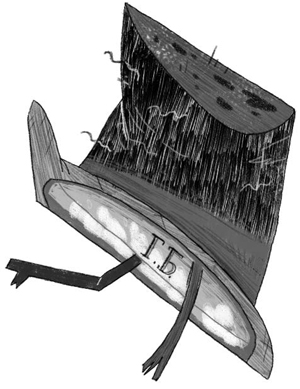 Вокруг него на полу валялось несколько газет, он смотрел на старую потрёпанную шляпу, висевшую на спинке стула перед ним. На стуле лежало увеличительное стекло, указывая, что Холмс, должно быть, внимательно изучал шляпу. Это могло означать только одно.