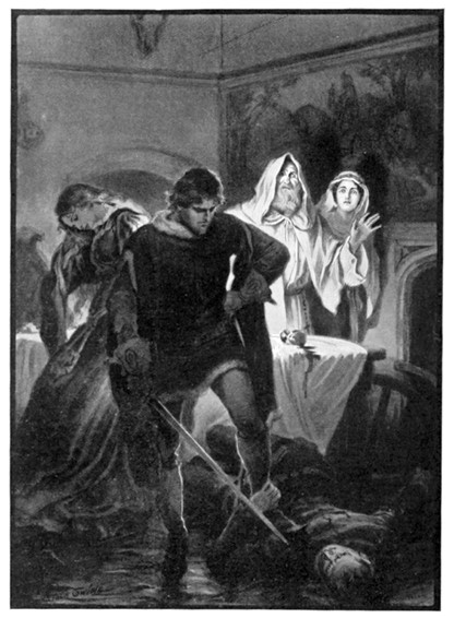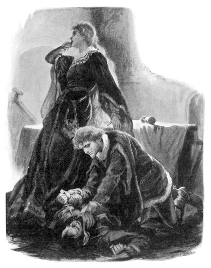Старик вбежал в залу вместе с леди Мэри, и они узрели в круге света нежданную картину – испуганная девушка в полуобмороке опиралась о стол, горбун лежал на полу, а Найджел попирал его ногой, держа меч у его груди.