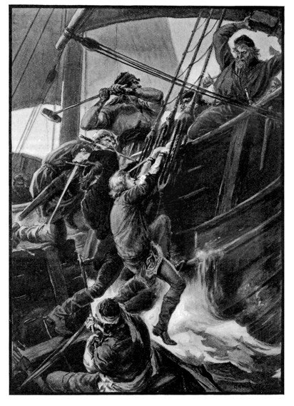 Мгновение спустя меч Найджела и молот Кока Бэддинга нашли свои жертвы и заставили противников отступить. Все пятеро благополучно выбрались на палубу, однако самое трудное было еще впереди. Французские моряки, нормандцы и бретонцы, вооруженные топорами и мечами, отличались крепостью и силой. Ни в храбрости, ни в умении отказать им было нельзя. Они напали на маленький отряд со всех сторон. Черный Саймон свалил чернобородого французского шкипера, но тут же сам упал с рассеченным скальпом. Сокрушительный удар топора покончил с Уотом из Хита. Найджела сбили с ног, хотя он тут же вскочил и пронзил мечом нападавшего.
