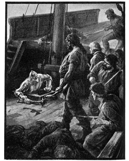 Люк в нутро корабля находился у подножия мачты, и они было направились к нему, но тотчас застыли на месте, ошеломленные нежданным зрелищем. В темном квадрате люка возникла круглая медная голова. Мгновение спустя за ней последовали сверкающие плечи, и на палубу медленно поднялся человек, с ног до головы облаченный в кованые доспехи. Правая рука в железной рукавице сжимала тяжелую железную булаву. Высоко подняв ее, он двинулся на врагов в гробовом молчании, только поножи гремели по палубе. В этой фигуре было что-то нечеловеческое: грозная, устрашающая, лишенная хоть какого-то выражения, она размеренным шагом приближалась к ним, неумолимая и чудовищная.