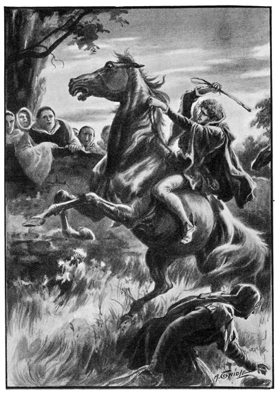 К тому времени, когда молодой сквайр договорил, он уже забрался на ограду и встал на ней, в одной руке сжимая уздечку, в другой хлыст. Он казался воплощением изящества и пылкого мужества. С яростным фырканьем конь ринулся к нему, скаля сверкающие белые зубы, но вновь удар тяжелой рукоятки заставил его отпрянуть, и в этот миг, хладнокровно измерив расстояние, Найджел изогнулся, ловкая фигура мелькнула в воздухе, и сильные колени сжали крутые золотистые бока. Но без седла и стремян удержаться на широкой спине оказалось не так-то просто: конь вставал на дыбы, бил задом, и минуту победа вот-вот могла остаться за ним. Однако ноги всадника были словно две стальные полосы, приклепанные к дугам конских ребер, его левая рука, погруженная в песочно-рыжую гриву, ни на мгновение не расслабила хватки.