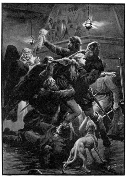 И в тот же миг дюжие лучники набросились на Найджела, как гончие псы на оленя. Найджел рванулся к своему мечу, который лежал на железном сундуке. С силой, рожденной не столько крепостью тела, сколько крепостью духа, он потащил их всех туда, но ключарь схватил меч, а лучники повалили отбивающегося сквайра на пол и опутали веревкой по рукам и по ногам.