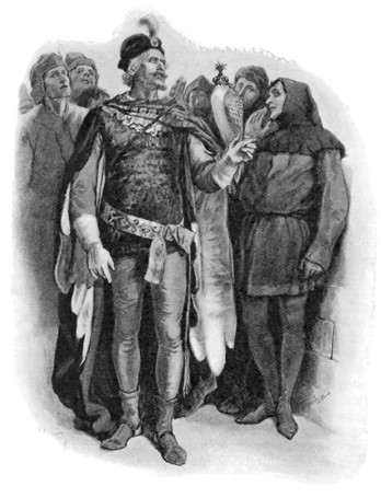 Одежда незнакомца была столь же примечательной, как и его облик: пышный лиловый дублет и плащ с гербом, напоминавшим клин, воротник из дорогого кружева на плечах, в мягких складках которого переливалось червонное золото тяжелой цепи. Рыцарский пояс и позвякивавшие на мягких сапогах из оленьей кожи золотые рыцарские шпоры указывали на его ранг, а на запястье левой руки в кожаной перчатке чинно сидел в клобучке маленький сокол – сам по себе уже свидетельство высокого положения его хозяина. Оружия при нем не было никакого, но за спиной на черной шелковой ленте висела лютня, и ее коричневый гриф торчал над его плечом. Вот какой человек, незаурядный, насмешливый, властный, обладавший какой-то особой внушительностью, смерил взглядом противостоящие группы людей с мечами и разъяренных монахов, заставив все головы повернуться к себе.