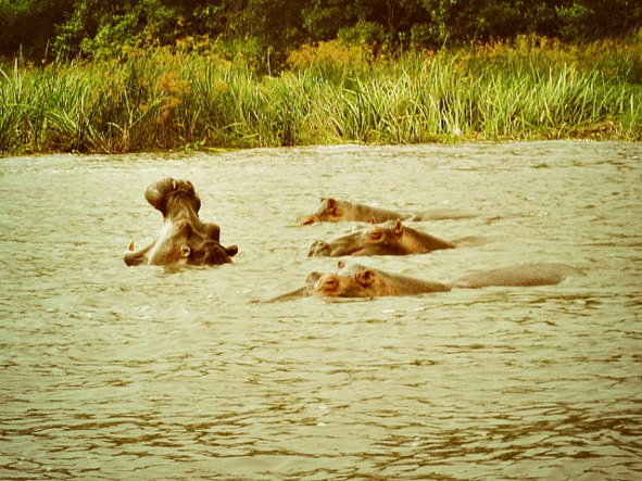 А с наступлением рассвета народ стал потихоньку «выкатываться» из жилищ. Я быстро надела обувь, подобрала шнурки и бросилась на поиск бегемотов. Они сидели в воде недалеко от пирса. Их глаза и маленькие ушки, как рожки торчали из воды. Были они совсем не агрессивны, а просто милы и обаятельны. Видимо, хороший завтрак задобрил их дурной нрав.