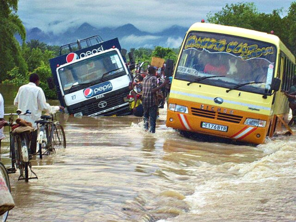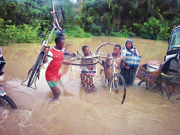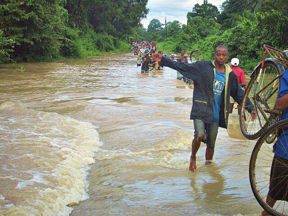 Вышли из стремительного разлива благополучно, а тут к переправе подошёл микроавтобус. Набирали людей до деревни Кьела. Сопровождающий очередного маршрута обещал хорошую дорогу впереди. Говорил, что «ноу проблем». Мы решили продвигаться и не выжидать свой полузатопленный автобус, который постепенно сносило наводнением. Он почти наполовину залит, а там остались женщины с детьми. Как они?