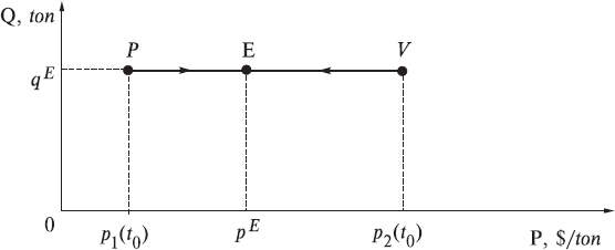 Fig. 3. Dynamics of the classical one-good, two-agent market economy in the price-quantity space, where quantity of the good traded, q, is constant. The economy is moving really in the price space.