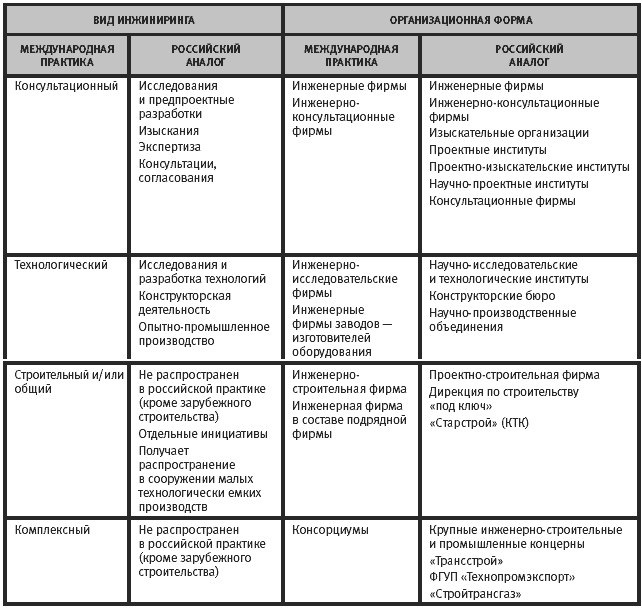 При сопоставлении международной и российской практик ведения инжиниринговой деятельности заметны существенные различия в организационных формах и системе взаимоотношений инжиниринговых фирм с участниками инвестиционно-строительного процесса (табл. 1.5.1).