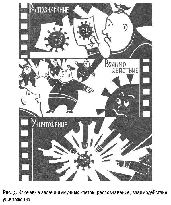 В основе иммунного ответа лежат три действия, которые на русском языке можно обозначить эффектной аббревиатурой РВУ: распознавание, взаимодействие, уничтожение.