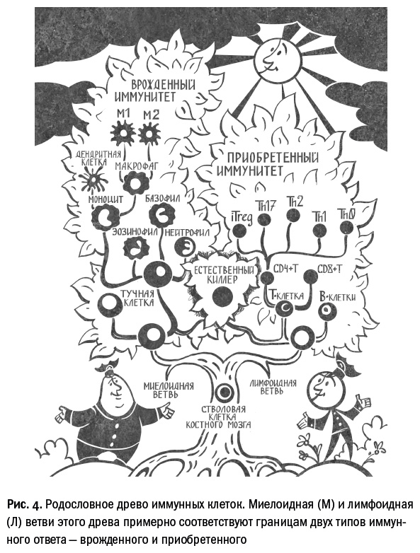 М-клетки подобны заслуженным полицейским-универсалам, работающим по старинке; Л-клетки – молодые эксперты, блестяще решающие узкоспециальные задачи, но за их границами беспомощные, как любой обыватель. Возрастные метафоры здесь не случайны: в эволюционном смысле М-клетки древнее Л-клеток. Миелоидные клетки обеспечивают базовый, врожденный иммунитет, который в том или ином виде присущ всем многоклеточным животным. Лимфоидные клетки отвечают за более тонкие и специфические защитные реакции, получившие название приобретенного, или адаптивного, иммунитета. Однако как молодому амбициозному детективу редко удается добиться успеха без помощи пусть немного старомодного, но опытного и знающего жизнь коллеги, так и Л-клетки нуждаются в М-клетках для выполнения своих функций.