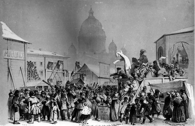 Гулянье на Адмиралтейской площади, как вспоминает Петр Гнедич, «носило чисто демократический характер. „Чистой“ публики здесь почти не было. Фабричные, горничные, кухарки, мастеровые, мелкое купечество, приказчики – вот главный состав толпы. И то, что предлагалось ей, не выходило из уровня их понимания, и вполне их удовлетворяло. <…> „Чистая“ публика каталась вокруг площади в открытых санях и в каретах»291.