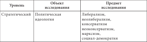 На стратегическом уровне анализа политики рассматриваются политические идеологии.