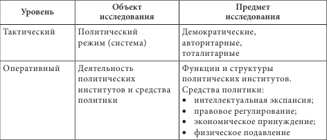 На тактическом уровне необходимо проводить анализ и исследование политических режимов и систем, реализующих в практической политической деятельности лежащие в их основе ключевые идеологические постулаты, определяющие сложившуюся устойчивую систему общественных отношений – политических, социальных, экономических и т. д.