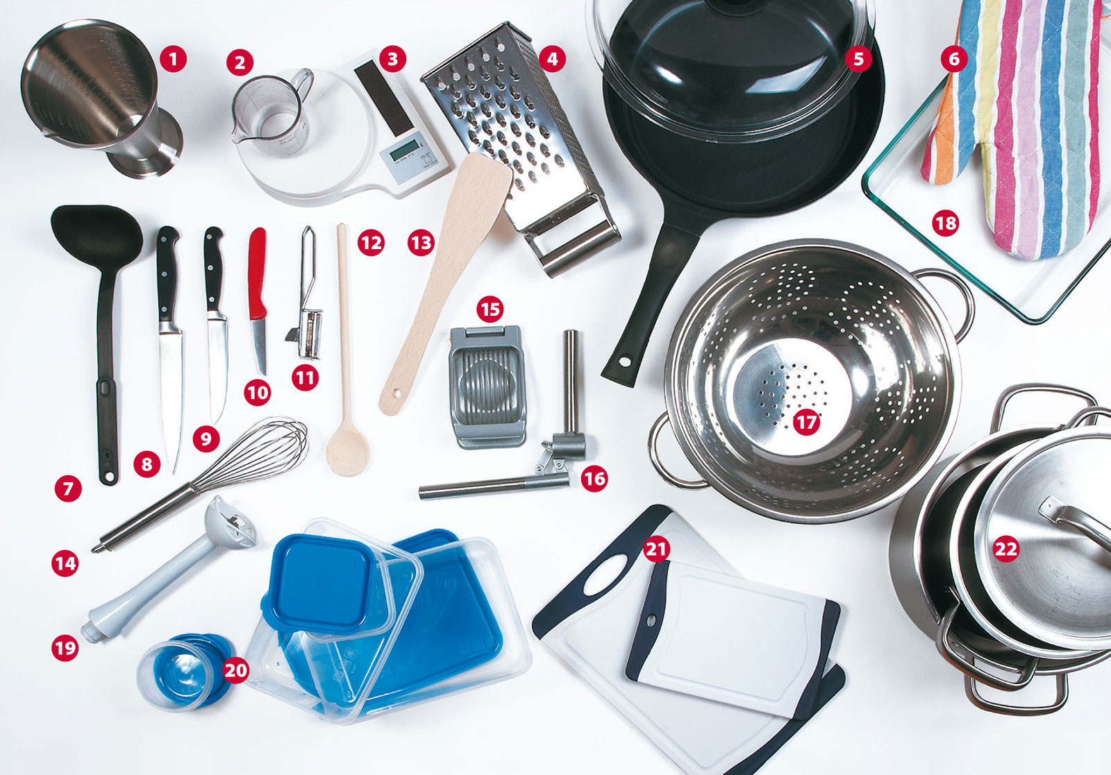 1 Messbecher, groß 2 Messbecher, klein 3 Küchenwaage 4 Reibe 5 Pfanne mit Deckel 6 Topfhandschuh 7 Schöpfkelle 8 Messer, groß 9 Messer, mittelgroß 10 Messer, klein 11 Sparschäler 12 Kochlöffel 13 Pfannenwender 14 Schneebesen 15 Eierschneider 16 Knoblauchpresse 17 Nudelsieb 18 Auflaufform 19 Pürier-/Schneidstab 20 Vorratsdosen 21 Schneidebretter 22 Kochtöpfe