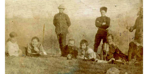 Фото №51. Прогулка на Тхачи – Хачук. 1918 год. Слева направо: Лида Волкова, Мотя Кошевец, стоят двое муж. (чин) с перевала, Борис Сычугов, Костя Череватенко, Животко Елена, Люба Калитаева и Иван с палкой.