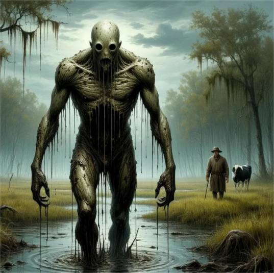 И тогда из тумана возникла фигура. Огромная, непропорциональная, человекоподобная, но совершенно искаженная, словно кошмар, принявший форму. Она была покрыта слизью и тиной, точно только что вынырнула из трясины. На месте глаз зияли пустые, бездонные глазницы, а из скрю