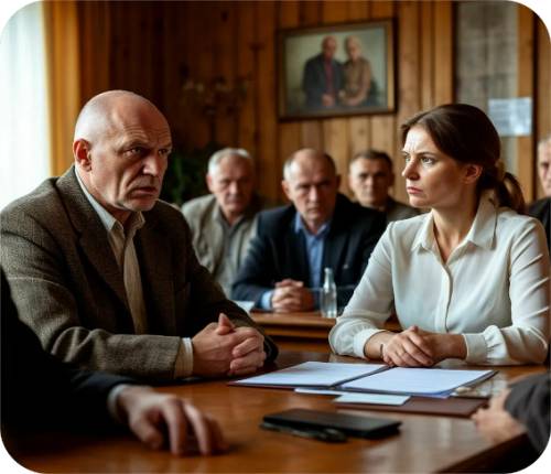 Андрей, войдя в кабинет, увидел за столом несколько человек, лица которых выражали усталость и раздражение. Он сразу понял, где глава администрации – мужчина лет пятидесяти с уставшими глазами сидел во главе стола, словно хозяин положения. Рядом сидел мужчина в потертом пиджаке, явно главный бухгалтер, с осунувшимся лицом и потухшим взглядом, и женщина средних лет в строгой блузке, казалось, связанная с социальной работой, и излучающая деловитость.