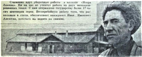«В начале шестидесятых годов, когда в Тесинском колхозе „Искра Ленина“ подбирали человека, кто бы мог возглавить свинотоварную ферму, выбор пал на коммуниста Ивана Ивановича Аксютина. Прежде чем дать согласие, пошел на ферму. Походил, посмотрел на дела, поговорил со свинарками. И усомнился: недостатки укоренились так глубоко, что, казалось, исправить их быстро будет невозможно. Да, дела на ферме вызывали тревогу и у правления. Крупная ферма, а мяса она давала в год не более 300 центнеров. Ферма приносила громадные убытки. Горячо взялся за дело Аксютин. Навел порядок в расходовании кормов, убедил животноводов, что они могут и должны работать лучше, больше давать продукции. Через год ферма продала уже 500 центнеров мяса, еще через год и этот показатель остался далеко позади. Дни и ночи Иван Иванович находился на ферме, организуя дела, помогая коллективу. И ферма преобразилась, изменились условия труда: в свинарнике много механизмов, светло и сухо. В 1973 году с объединением в одно крупное хозяйство трех колхозов слили и свиноводческие фермы. Пришлось вести реконструкцию помещения, где разместить всех животных. Коллектив фермы с честью выполнил новый, немного увеличенный план. В третьем году девятой пятилетки продал государству свыше 2400 центнеров свинины. В конце 1973 года тесинцы сердечно чествовали ветерана. Дело в том, что настал срок уходить Ивану Ивановичу на заслуженный отдых. Он поблагодарил за внимание и сказал: „Пока есть во мне силы, буду и дальше добросовестно трудиться“. И трудился, пока мог. В 1937 году молодой Аксютин возглавлял полеводческую бригаду. В послевоенные годы много лет руководил колхозом „Объединенный труд“ в д. Кутужеково. Трудовой путь Ивана Ивановича отмечен высокими наградами: орденами Октябрьской Революции, Трудового Красного Знамени, многими медалями. Он не раз избирался депутатом районного совета, членом райкома партии».