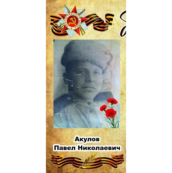 Акулов Павел Николаевич. 1924. Приезжий. Место рождения: д. Коржавино Тонкинского района Горьковской области. Место призыва: Тонкинский РВК Тонкинского района Горьковской области. Призван 18.08.1942 г. Воинская часть: 322 гв. минп СВГК ЛенФ. Кто наградил: 322 гв. мп. Наименование награды: медаль «За боевые заслуги». Из книги приказов: «Медаль „За боевые заслуги“ телефониста 462 Гвардейского минометного дивизиона, гвардии рядового Акулова Павла Николаевича. В разгаре боя под Нарвой 2.02.40 г. произошел порыв телефонной линии, связующей ОП с НП дивизиона. Не ожидая распоряжений, тов. Акулов под сильным артобстрелом противника восстановил своевременную связь, чем способствовал своевременной даче залпов по живой силе и технике противника, обеспечив этим продвижение наших стрелковых частей. 1924 г. р., русский, беспартийный, призван Тонкинским РВК Горьковской области. Домашний адрес: (заклеено)». Приказ подразделения: №5/н от 04.05.1945 г. Издан 65 гв. минп 1-го Украинского фронта. Архив: ЦАМО, фонд 33, опись 690036, ед. хранения 3426, № записи 38920055. Вторая медаль «За боевые заслуги». Боевой путь прошел до Праги. Умер в с. Тесь 10.12.1980 г.