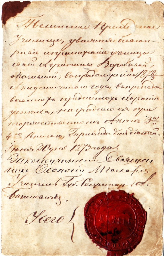С этим документом связана очень любопытная история: в паспорте школы за 1947 год датой открытия Приходского училища назывался 1897 год, и вполне естественно было считать, что в 1997 году школа отпразднует 100-летний юбилей. Но когда инициативная группа по подготовке к юбилею стала собирать материал по истории школы, то наткнулась на письмо Самковой Платониды Макаровны, выпускницы Тесинской школы за 1915 год, в котором она писала: «Прочитала в газете «Искра Ильича» заметку: «Ведём поиск. Когда твой юбилей, школа?» – Очевидно, речь шла о заметке в упомянутой газете от 6 января 1982 года, опубликованной школьной группой «Поиск» (во главе с учителями Г. М. Ксензик и Т. В. Мишиной). – «В отношении основания школы затрудняюсь ответить, но думаю, что всё-таки раньше предполагаемого вами срока – 1897 год, так как в этой школе учились мои старшие братья и сестры, а мой старший брат 1882 года рождения. И ещё посылаю «Похвальную грамоту» моей матери Воробьёвой Агрипины, выданную еще в 1872—1873 году».